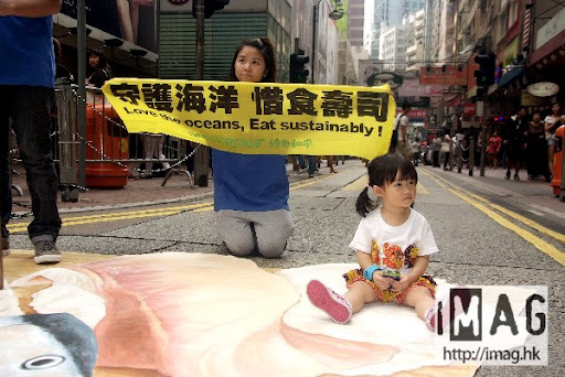 環保團體綠色和平在銅鑼灣行人專用區設立街站,放置一幅3D畫在地上,表達香港人喜愛進食壽司刺身令到全球過度捕魚,令海洋資源過度消耗,其中以吞拿魚、三文魚、鰻魚、劍魚及蝦最為嚴重。他們在現場派發單張,呼籲大眾少食壽司及刺身。